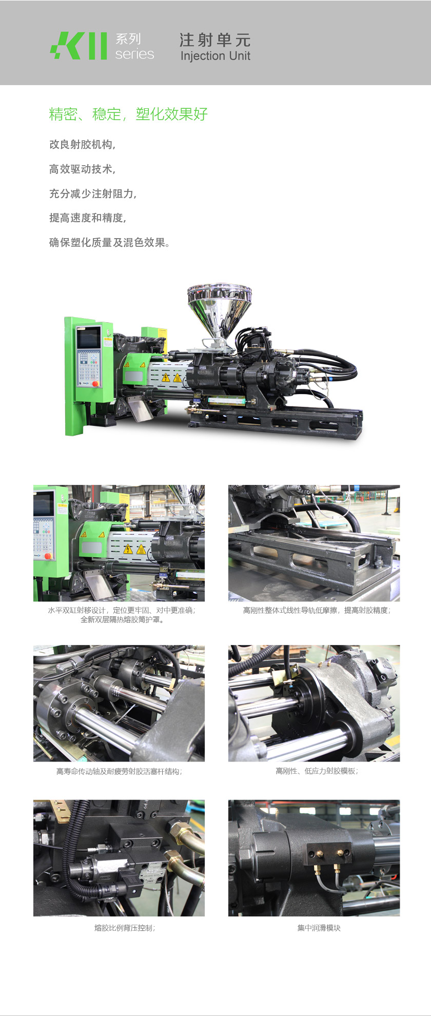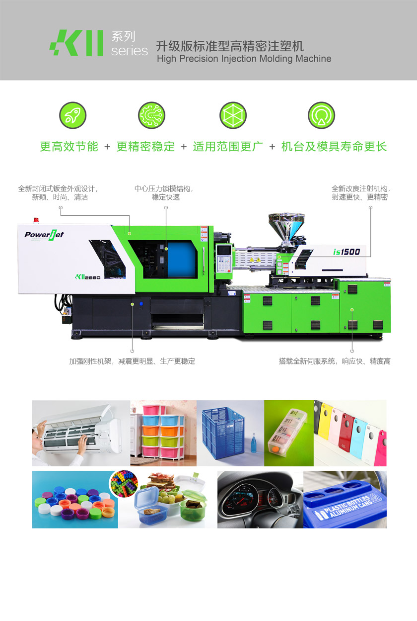节能稳定、快速高效,具有更快的注射和熔胶速度,更高的生产效率,适用于食品饮料包装、日常用品、电子通讯、家电、玩具等多个领域。